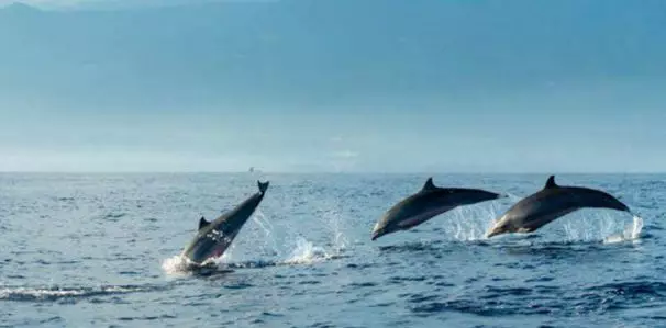 的水母,隨著暗流慢慢飄著;偶爾看見小海豚們在媽媽的陪伴下互相追逐,盡情的游著。