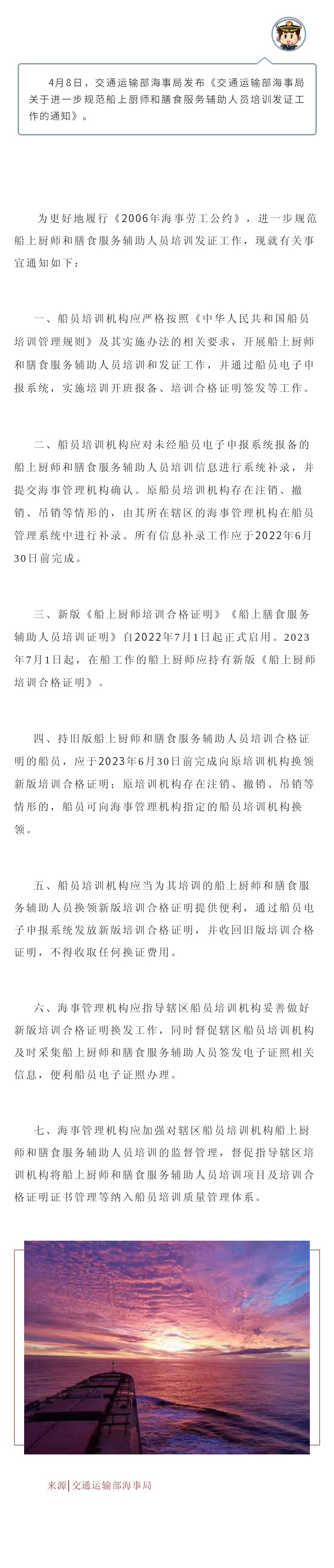 【最新政策】交通運(yùn)輸部海事局關(guān)于進(jìn)一步規(guī)范船上廚師和膳食服務(wù)輔助人員培訓(xùn)發(fā)證工作的通知
